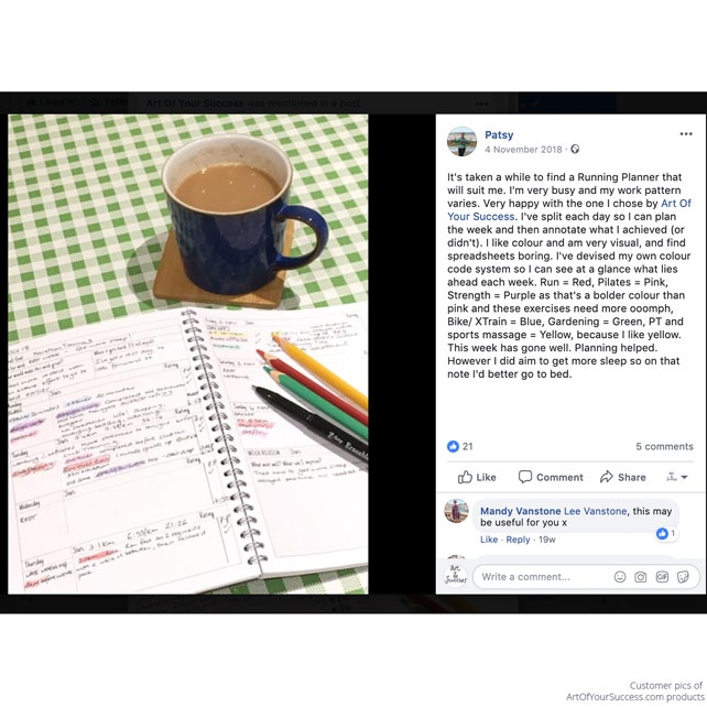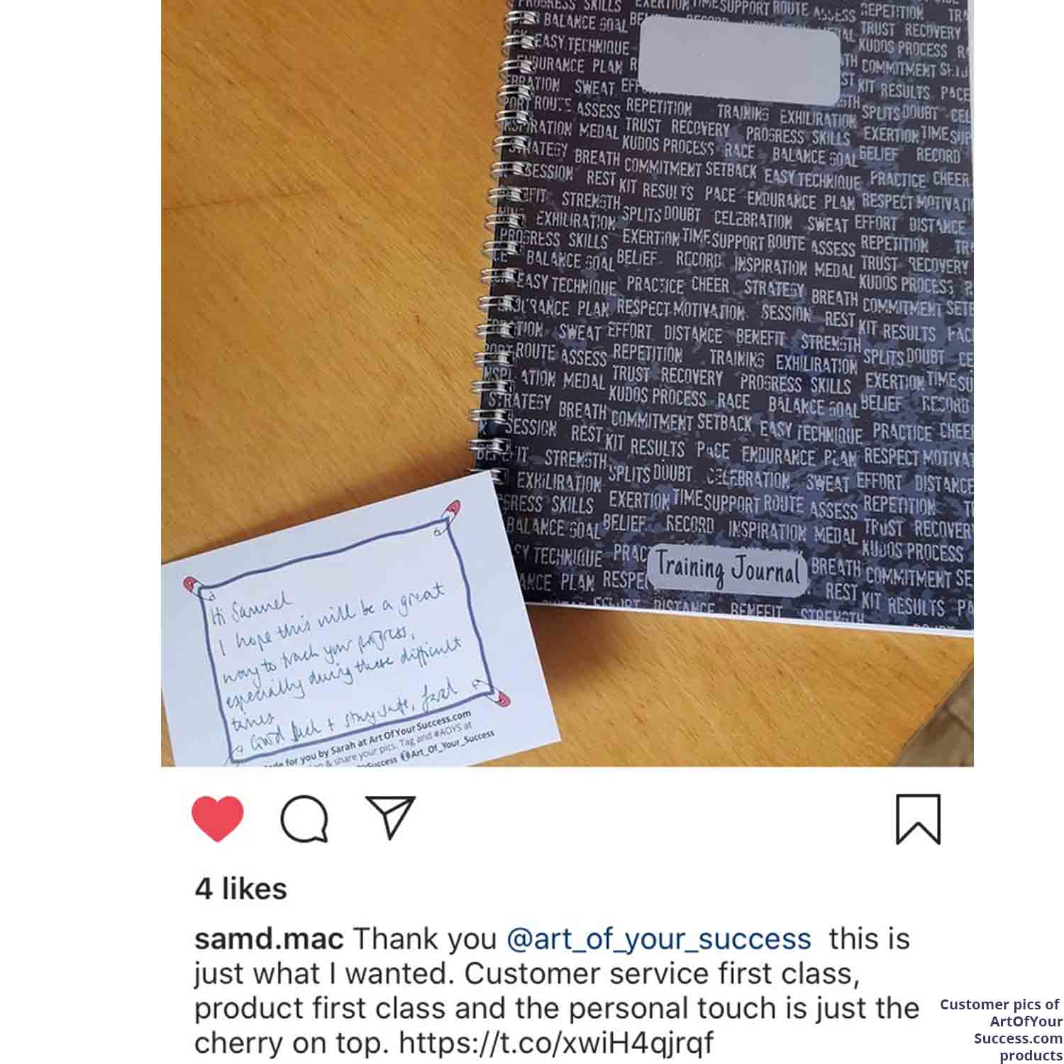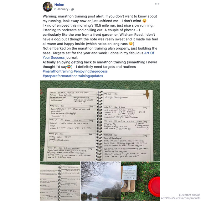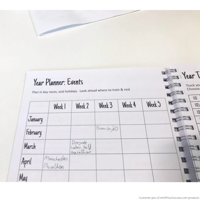 Fabulous accompaniment to a running year! It’s so well laid out and structured – but leaves plenty of scope for you to put your own spin on the content. I have found it so useful for the last three years keeping an eye on my own training and how I feel about it. Working through injuries and illness and recording thought processes during those times have helped enormously with the journey back. Having this compact handy journal close at hand encouraged me to document it so I can look back on it if it happens again. Thanks Art of Your Success. The perfect companion. Highly recommended.