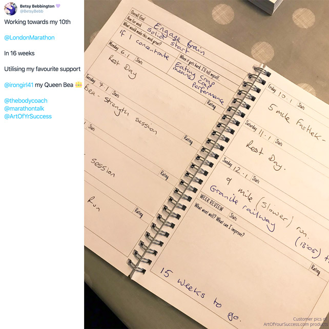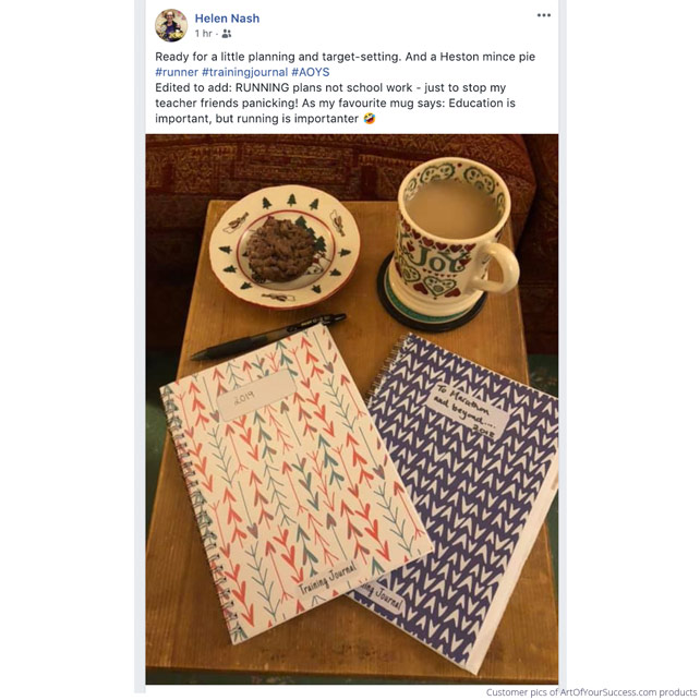 Fabulous accompaniment to a running year! It’s so well laid out and structured – but leaves plenty of scope for you to put your own spin on the content. I have found it so useful for the last three years keeping an eye on my own training and how I feel about it. Working through injuries and illness and recording thought processes during those times have helped enormously with the journey back. Having this compact handy journal close at hand encouraged me to document it so I can look back on it if it happens again. Thanks Art of Your Success. The perfect companion. Highly recommended.